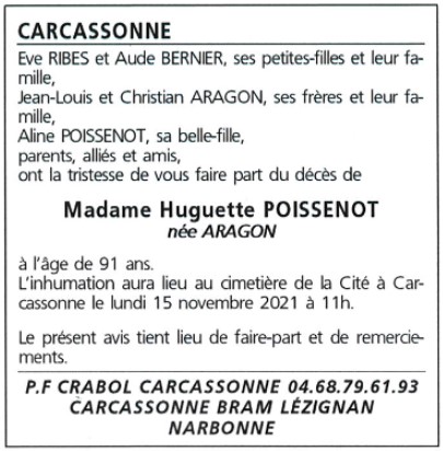 Née à Carcassonne (11000, France) le samedi 25 janvier 1930