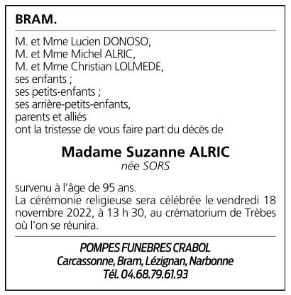 Décédée à Castelnaudary (11400, France) le mardi 15 novembre 2022 à l'âge de 95 ans