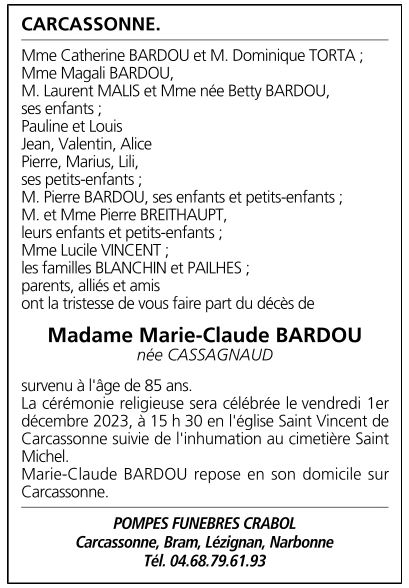 Décédée à Carcassonne (11000, France) le mardi 28 novembre 2023 à l'âge de 85 ans