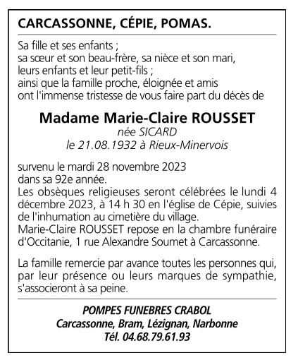 Décédée à Carcassonne (11000, France) le mardi 28 novembre 2023 à l'âge de 91 ans