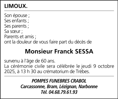 Décédé à Limoux (11300, France) le samedi 4 octobre 2025 à l'âge de 60 ans
