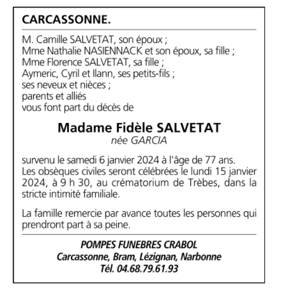 Décédée à Carcassonne (11000, France) le samedi 6 janvier 2024 à l'âge de 77 ans