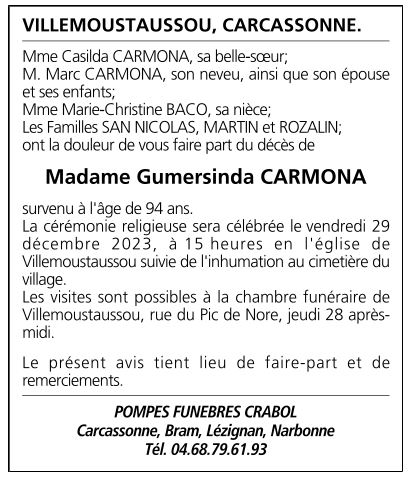 Décédée à Carcassonne (11000, France) le jeudi 21 décembre 2023 à l'âge de 94 ans