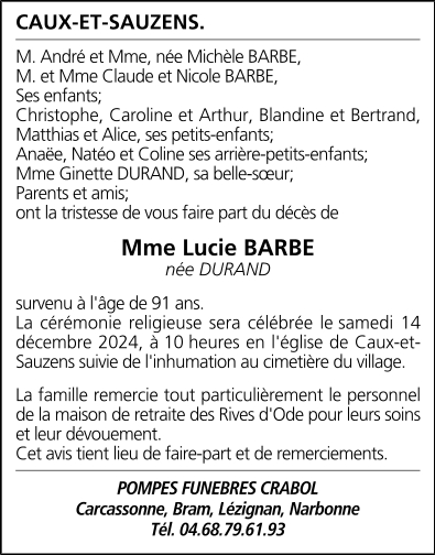 Madame Lucie BARBE née DURAND
