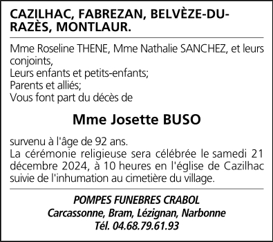 Décédée à Carcassonne (11000, France) le jeudi 19 décembre 2024 à l'âge de 92 ans