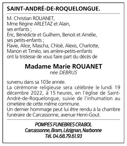 Décédée à Carcassonne (11000, France) le mercredi 14 décembre 2022 à l'âge de 102 ans